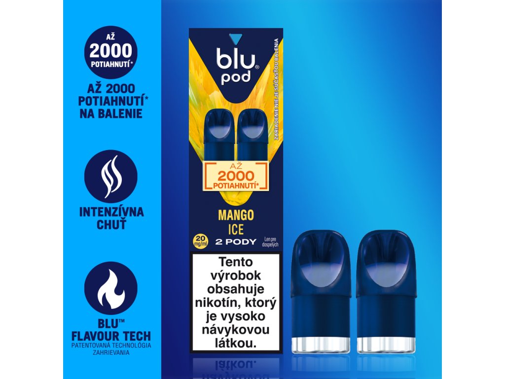 Blu Bar Pod Mango Ice je určená pre dospelých užívateľov nikotínu, ktorí hľadajú sladkú exotickú príchuť so sviežim ľadovým osviežením. Moderná a diskrétna alternatíva fajčenia – bez dymu a nepríjemného zápachu.